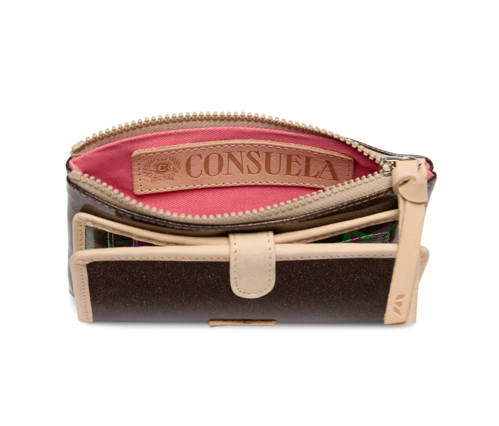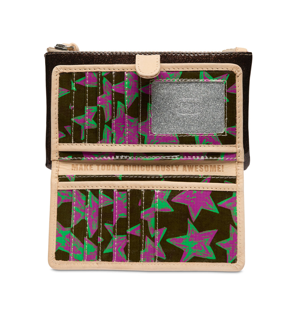 This Slim Wallet carries cards and cash without weighing you down. Open the snap closure to reveal an ID window pocket, 12 card slots, and 4 slide pocket compartments in this versatile leather wallet.
