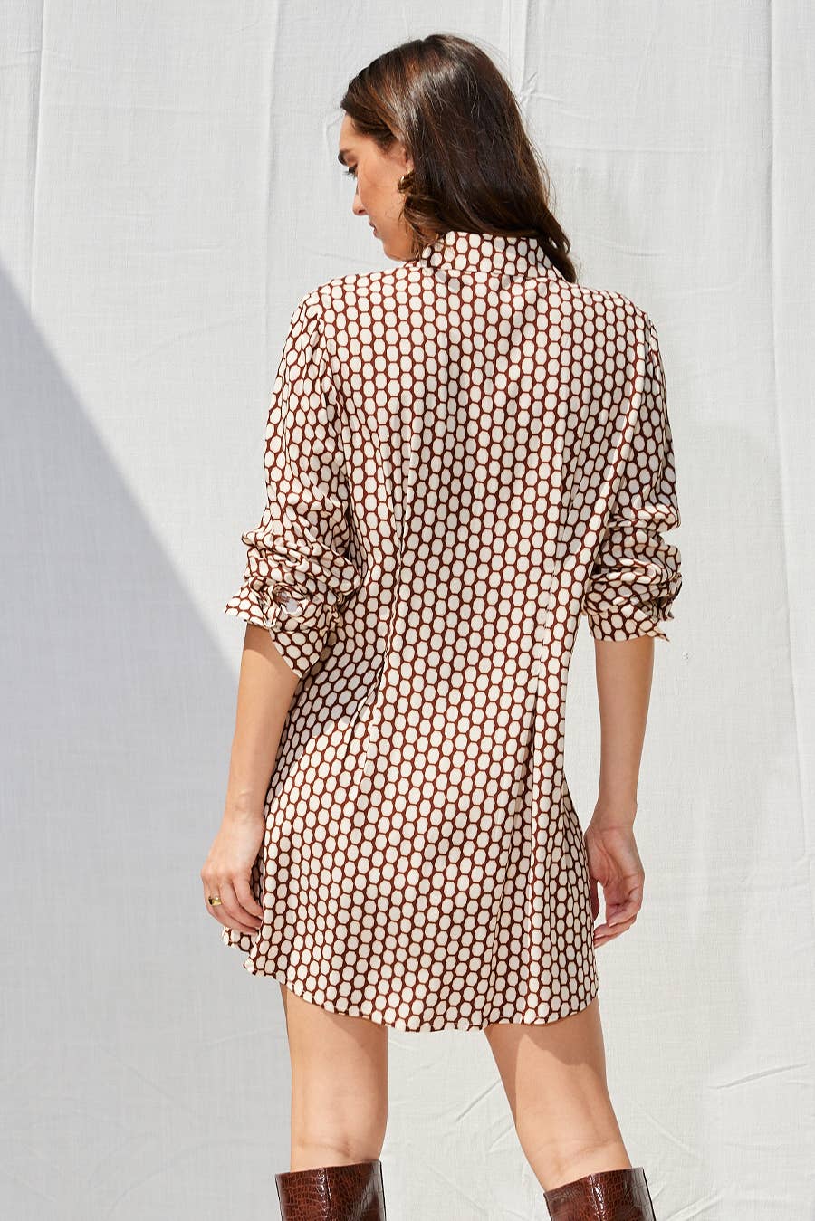 This printed brown shirt dress is a must-have for any fashion-forward individual! The pleat details add a touch of elegance, while the shell button down front and collar give it a classic look. With long sleeves and buttoned cuffs, this dress is perfect for any occasion.
