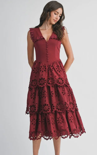 Cotton Lace Tiered Midi Dress in Dark Spice