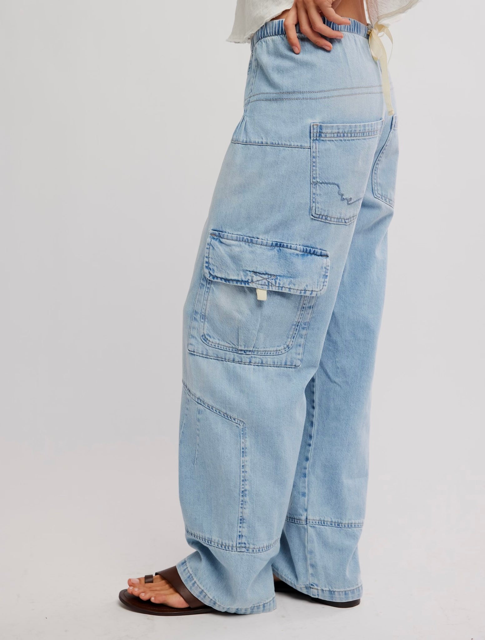 The easiest addition to your denim drawer, these effortless jeans are featured in a pull-on style with an elastic waistband and button front, cargo-inspired detailing throughout and adjustable details at the ankles.