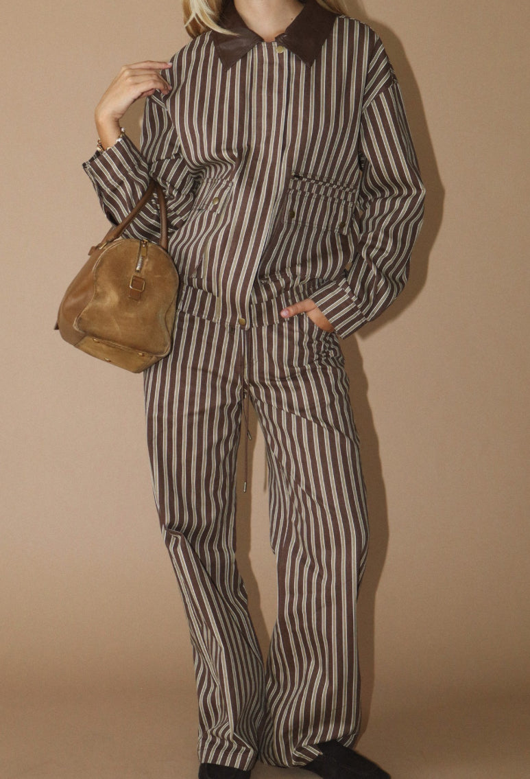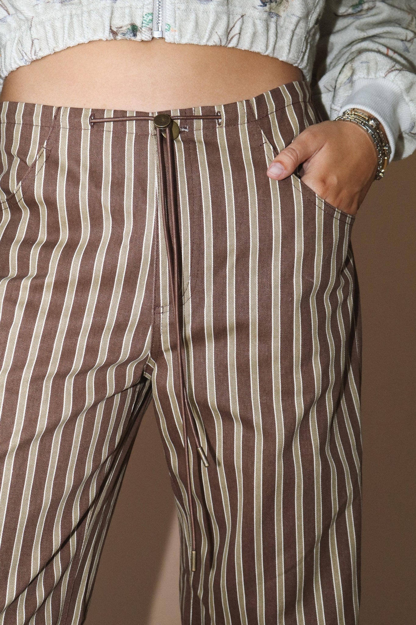 Get ready to elevate your wardrobe with these Striped High Waist Trousers in Brown. The bungee drawstring waist adds a unique touch while keeping you comfortable all day. Perfect for both work and play, these trousers will become your new go-to for a chic and playful look.