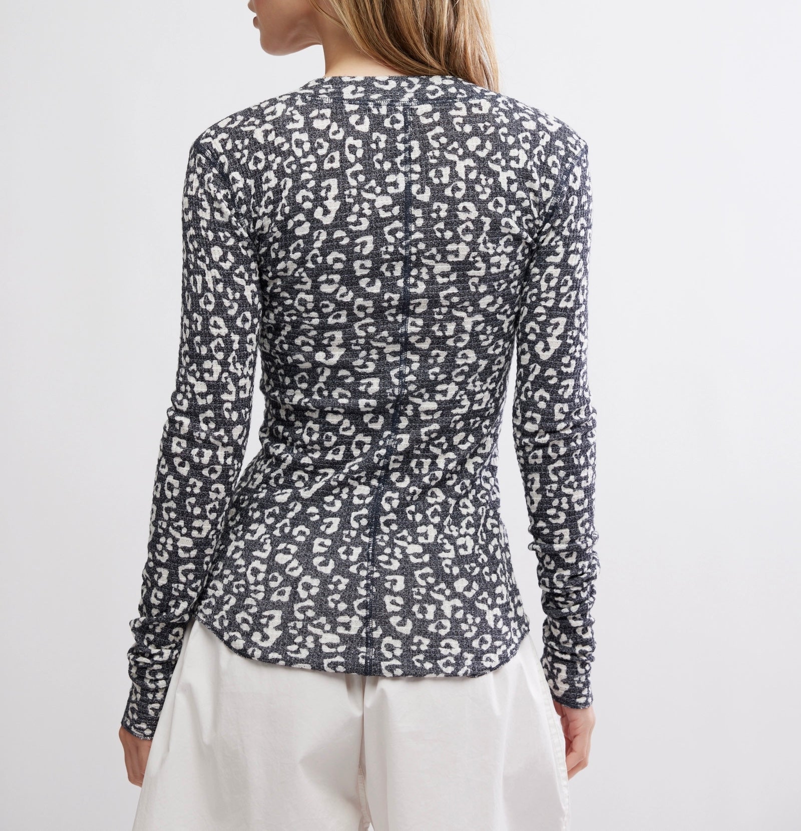 Features: Button-front closure, waffle knit fabrication, crew neckline, long fitted sleeves