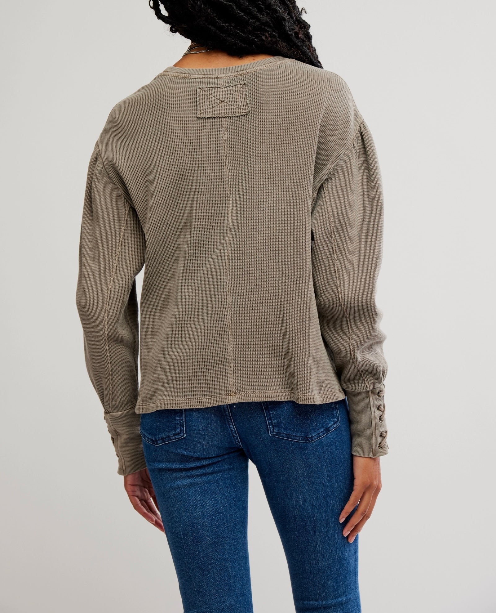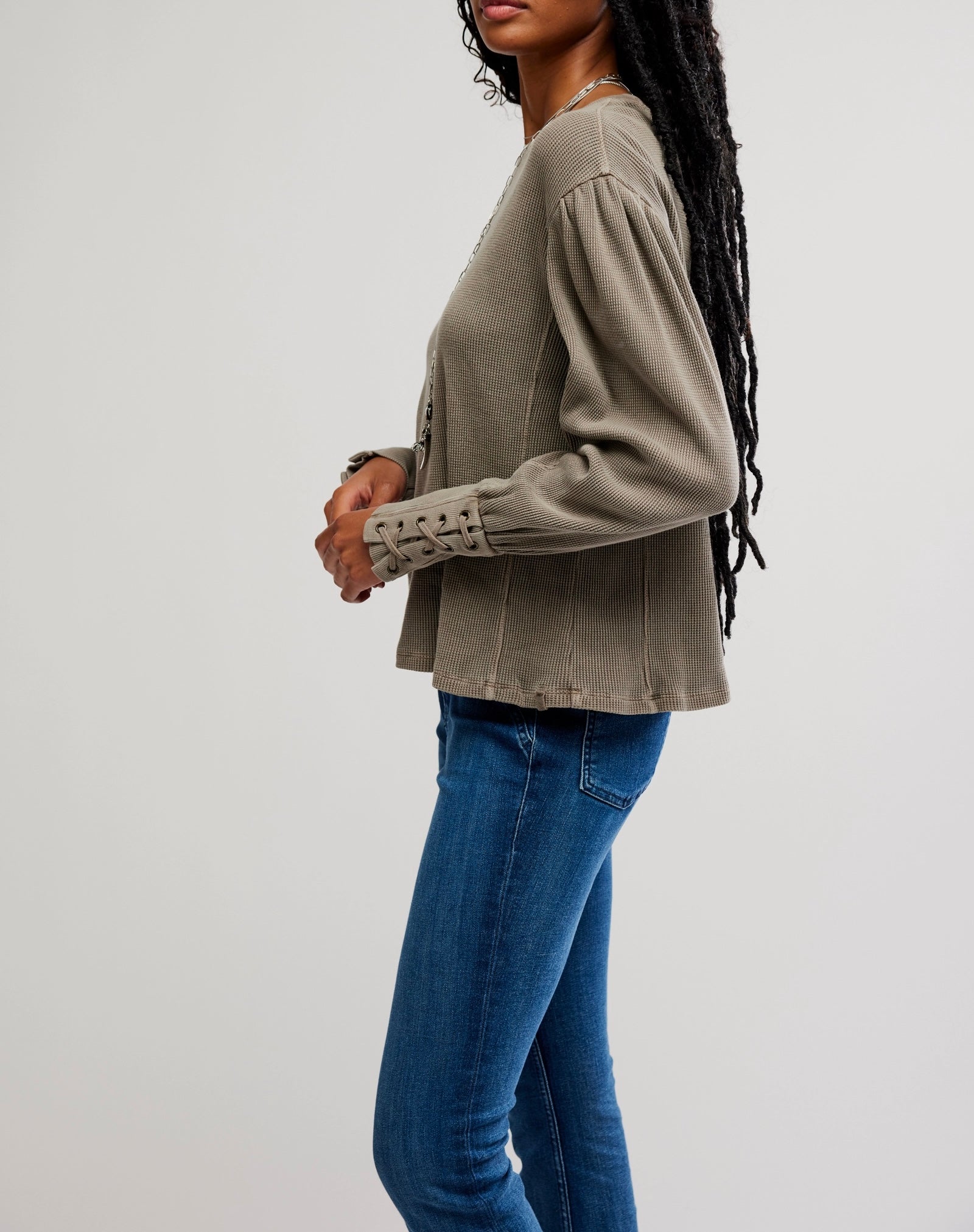 Lace-up details adorn the cuffs of this laidback long sleeve from We The Free, featured in a classic thermal fabrication with voluminous sleeves for added dimension.