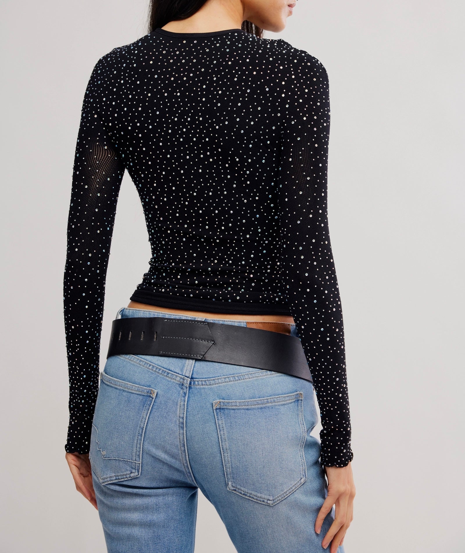 Glittering and gorgeous as a night sky, this long sleeve from Intimately adds a sparkling layer to your outfit, featuring a stretchy, lightweight fabrication and fitted sleeves with lettuce trim for a night-out-ready style.